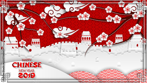 Great Wall Of China Cherry Blossoms Traditional Oriental Pattern Cherry Blossom Chinese New Year Wallpaper